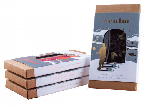 Our artisanal chocolate is handcrafted in small batches in beautiful British Columbia, Canada, using only premium chocolatier’s ingredients. Each bar contains 2 grams of psilocybin mushrooms, for a full sensory indulgence. At Realm we feel that a fulfilled life means being in touch with your inner spirit – therefore we value indulging in play, and the joy that it brings. We encourage you to enjoy piece by piece, or share one of our 5g bars with a friend (or 2!) and have an hyperdimensional adventure. It is our sincere wish that our chocolate bars will bring you a joyful experience, in a well deserved treat!